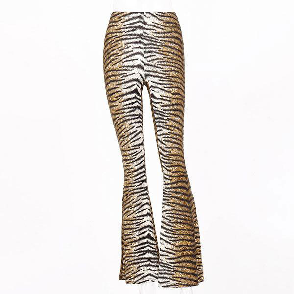 レディース フレアパンツ アニマル柄 トラ柄 ヒョウ柄 ハイウエスト ウエストゴム ロングパンツ ブーツカットパンツ ベルボトム ...