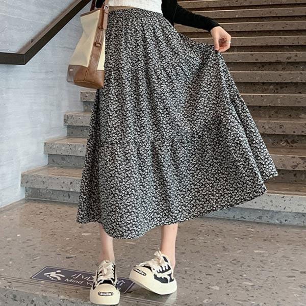 レディース ロングスカート 小花柄 フレア モノトーン スカート ロング丈 ウエストゴム 体型カバー ゆったり かわいい おしゃれ