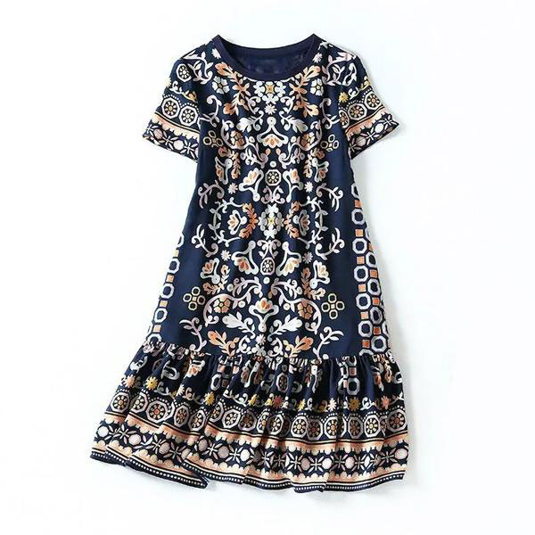 レディース 半袖ワンピース 膝丈 花柄 ラウンドネック Aライン チェックスカート シック かわいい おしゃれ 春 夏
