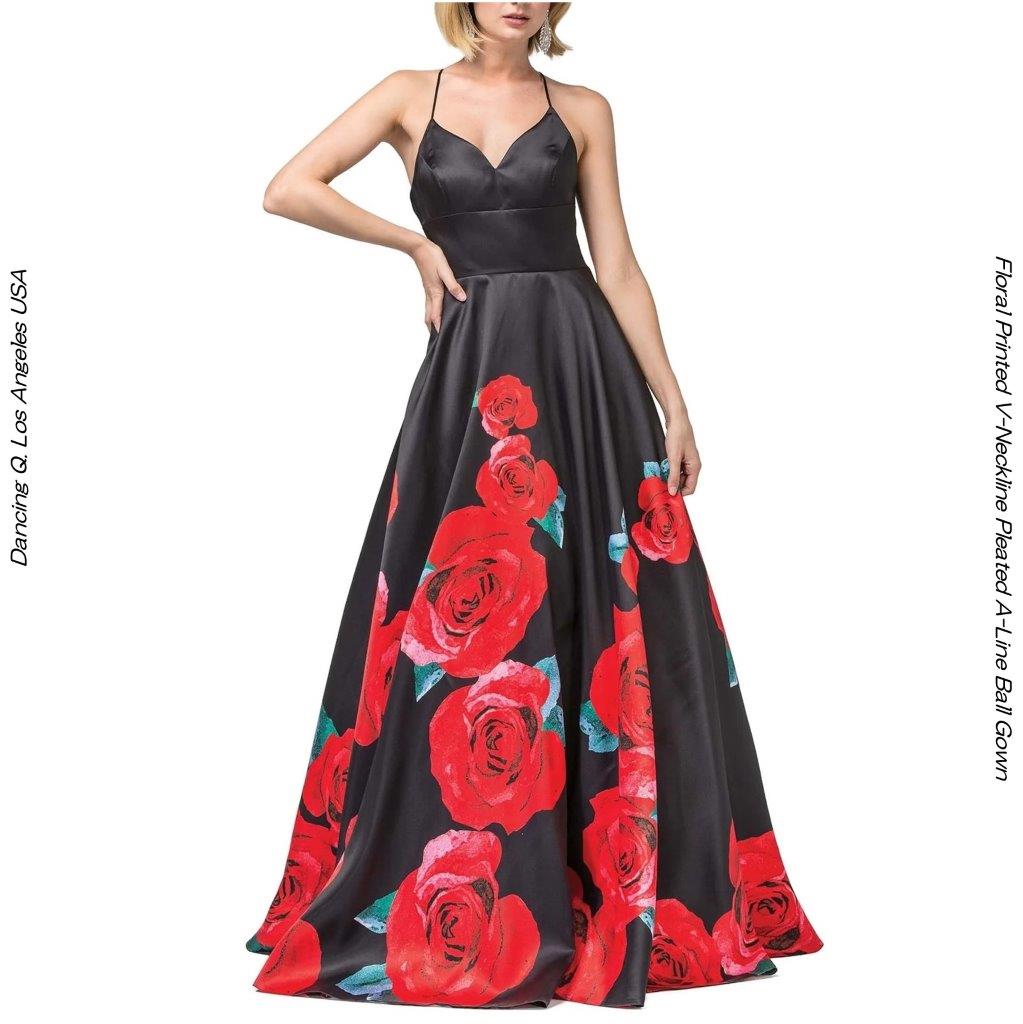 Aラインドレス サテンプリント 花柄プリント スパゲッティストラップ ブラックマルチ レッド インポートドレス大阪 プロム 演奏会...