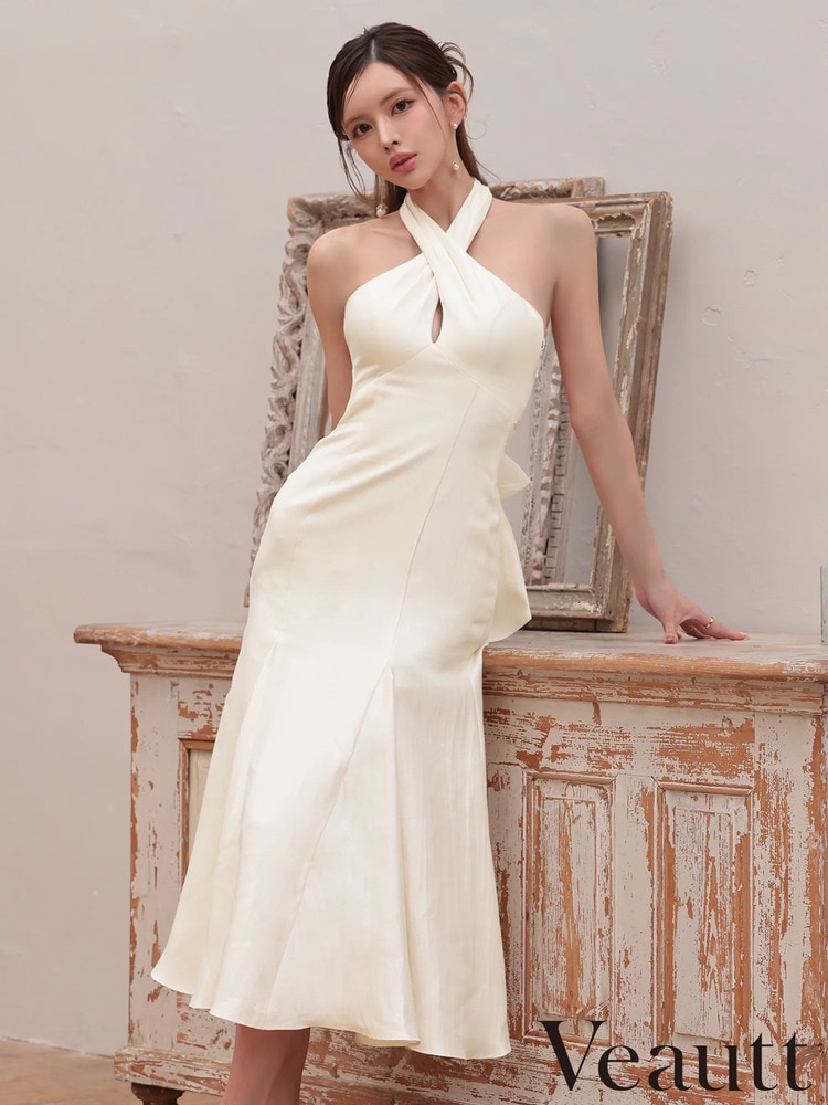 Veautt VT082606 フロントクロス ホルターネック バックオープン 背中リボン マーメード フレア ミディアムロングド...