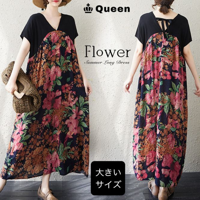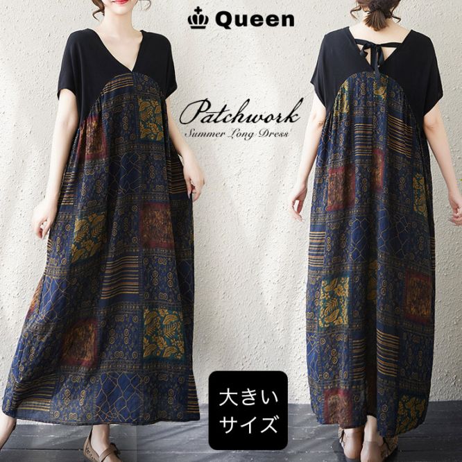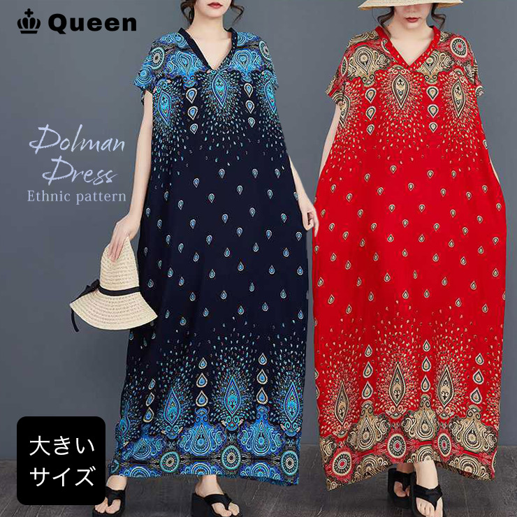 大きいサイズ レディース マキシワンピ ワンピース エスニック柄 ドルマンスリーブ Vネック 夏 50代 40代 (717039)