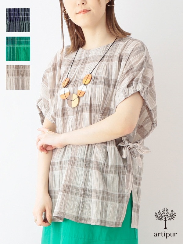 【30%OFF】グリーン・グレー各1点限り/シャーリングチェックコットン ブラウス 23S116