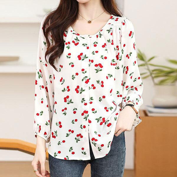 レディース シフォンシャツ 長袖 ブラウス チェリー柄 肌触り良い素材 ワンカラー 5サイズ 総柄 薄手 柔らかい Uネック 体型...