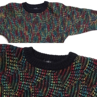 MINY ウールセーター 国内古着 レディース M-L/黒地x多色のリボン カジュアル モード ドルマンスリーブ クルーネック 丸...