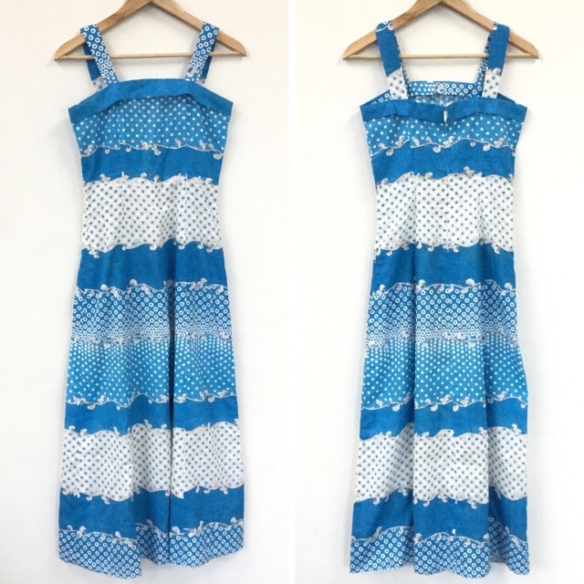 昭和レトロ ノースリーブワンピース ドレス レディース S-XS/白x水色 水玉 葉柄 モダン ドッド キャミワンピ 送料無料 国...
