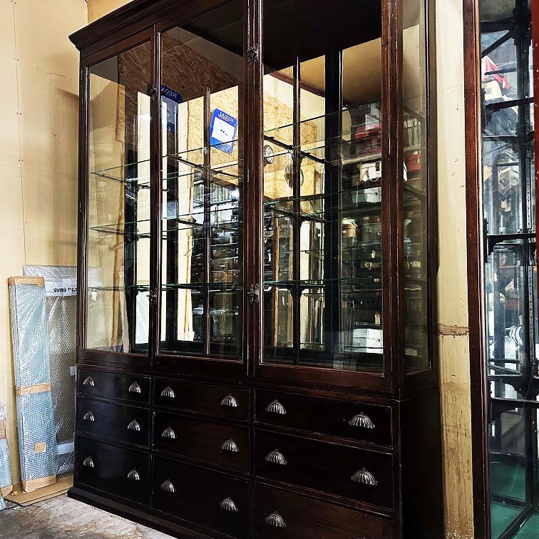 108410 販売及び長期リース店舗什器 英国製アンティーク 4段ガラス棚 3段引き出し付 ガラスショーケース