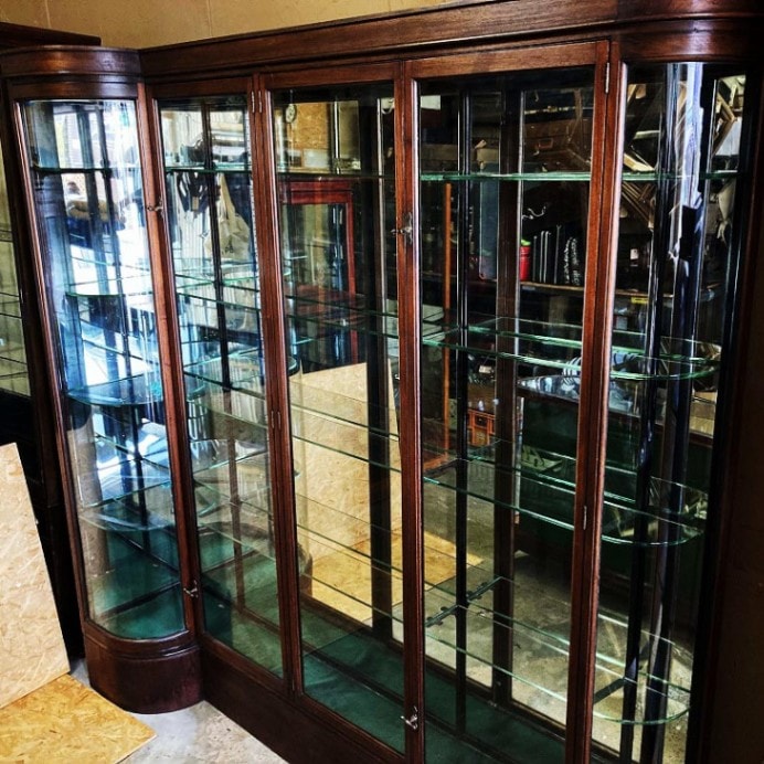 108409 販売及び長期リース店舗什器 英国製アンティーク 5段 曲面 ガラスショーケース