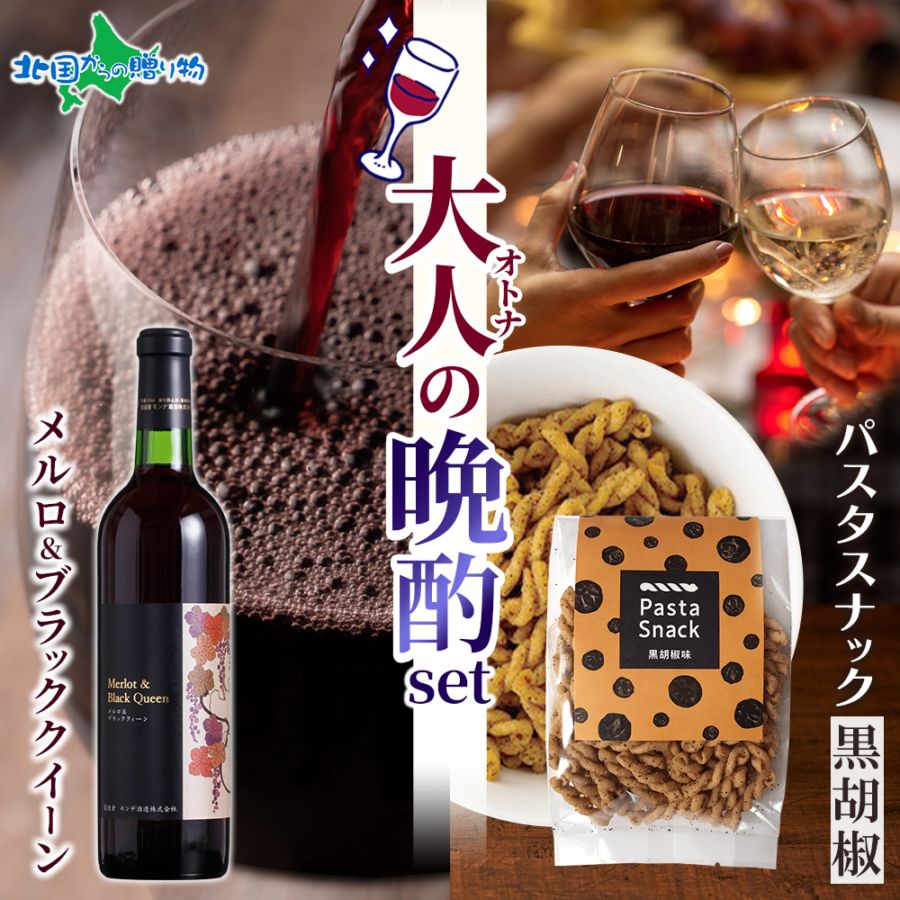 【年内終了 1/6(火)以降順次出荷予定】大人の晩酌セット メルロ&ブラッククイーン1本 720ml&パスタスナック(黒コショウ味...