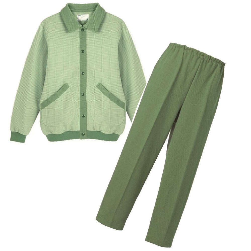 スクエアニット室内着裾リブ付き全開ズボン上下セット:グリーン