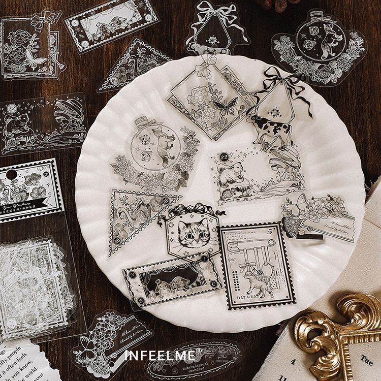即日出荷 海外 ステッカー シール 珍しい 透明 透ける PET フレークシール クリア PET素材 切手 白黒 黒白 モノトーン...