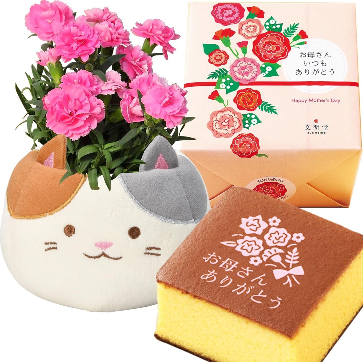 母の日 カーネーション 鉢花 花鉢 鉢植え 文明堂 カステラ フラワーギフト 三毛猫