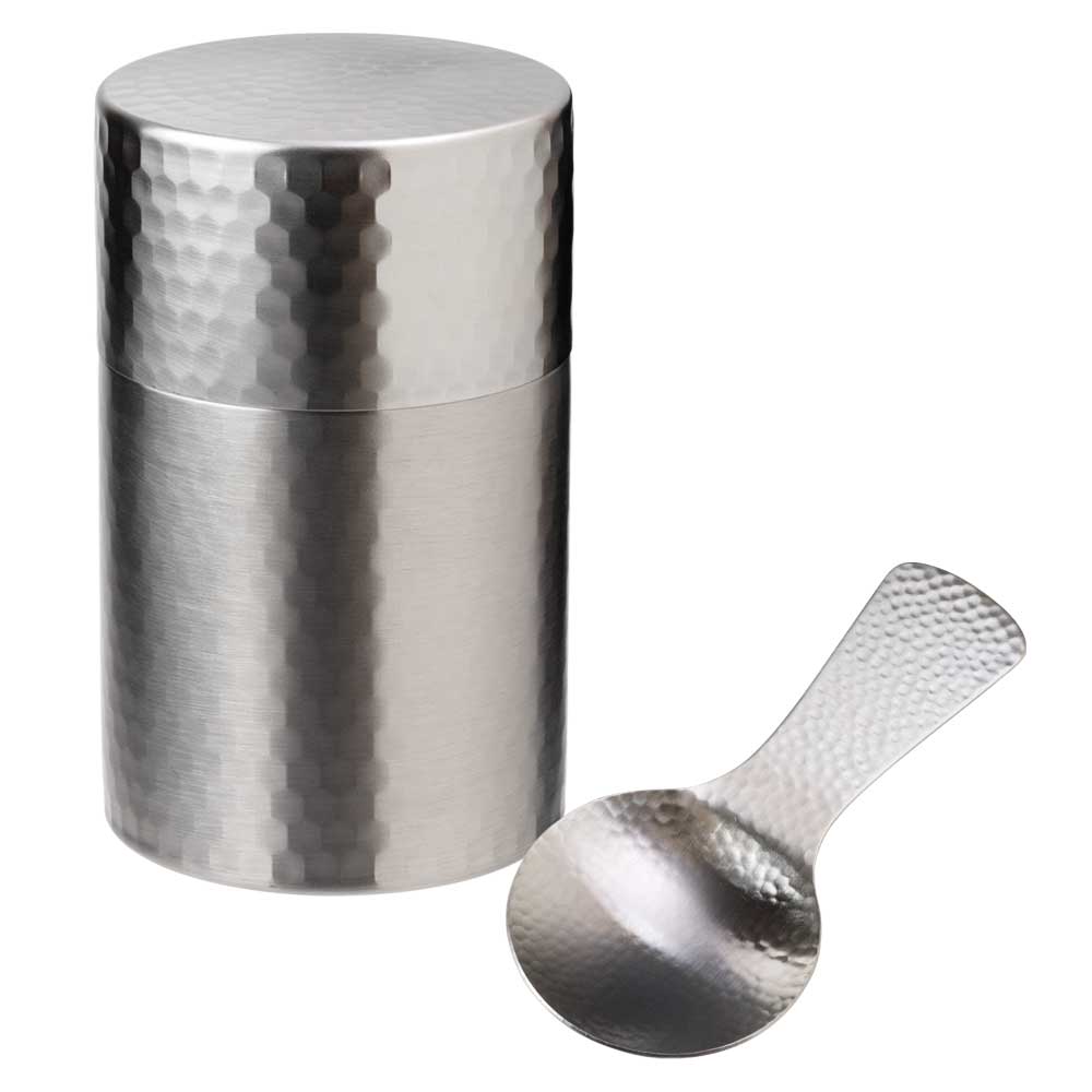 槌目のステンレス茶筒+槌目の茶さじセット 槌目つや消し 落ち着きのある金属の質感 汚れがつきにくく清潔 茶葉の風味が長持ち 新潟県...
