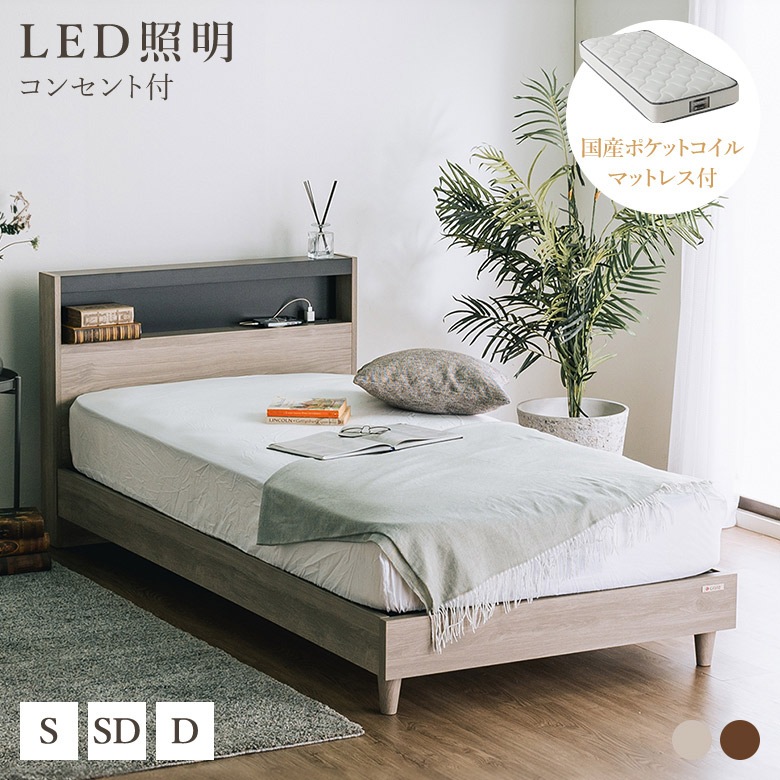 ベッド マットレス付き グレージュ ベッドフレーム ポケットコイル 国産マット付き LEDライト&棚付き&コンセント シングル ...