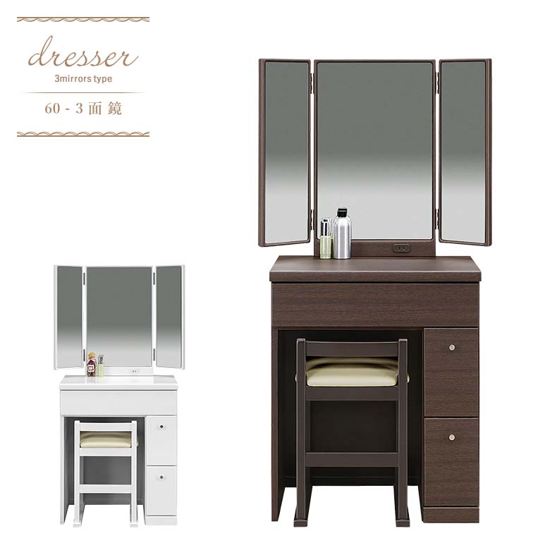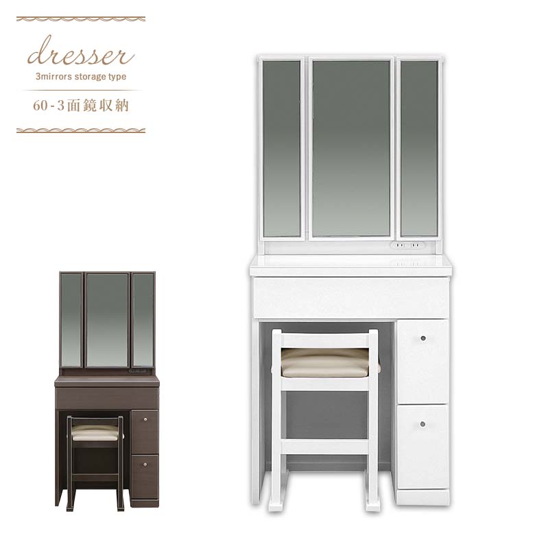 3面鏡 収納BOXドレッサー 幅60cm スツール付き 木目調ブラウン/ エナメル塗装 ホワイト コンセント口付 コンパクト 鏡台...