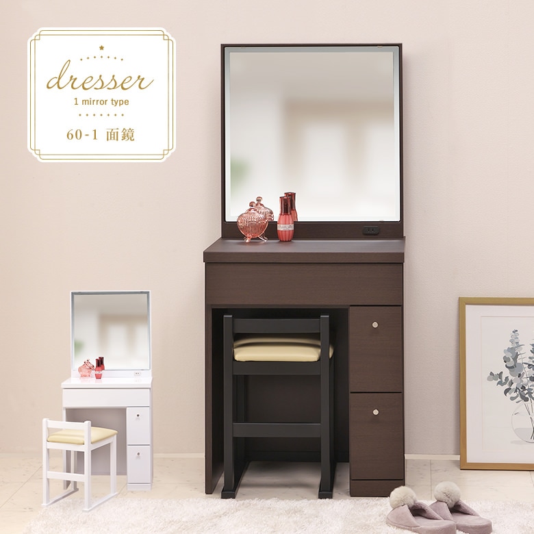 1面鏡ドレッサー 幅60cm スツール付き 木目調ブラウン/ エナメル塗装 鏡面ホワイト コンセント口付き コンパクト 鏡台...