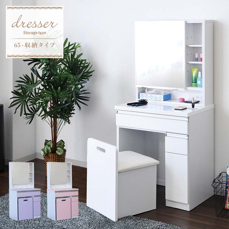1面鏡 収納ドレッサー 幅65cm スツール付き ピンク /ホワイト/ パープル 鏡台 メイク台