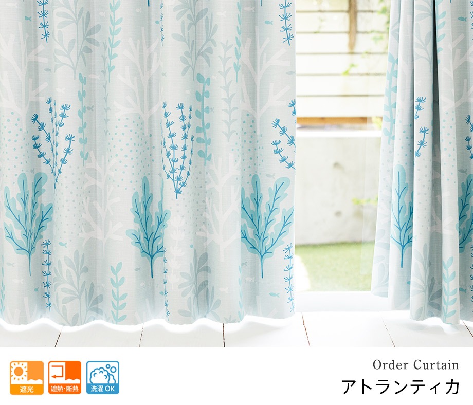 海をモチーフにした可愛いプリントの2級遮光カーテン「アトランティカ」ブルー