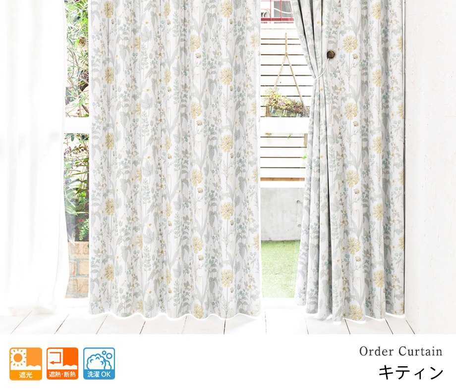 ボタニカル柄の中に隠れた猫が可愛い2級遮光カーテン「キティン」グレー
