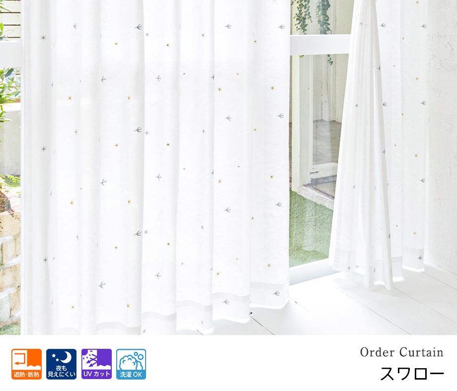 つばめと星柄がシルバーとゴールドの糸で刺繍された遮像レースカーテン「スワロー」ホワイト