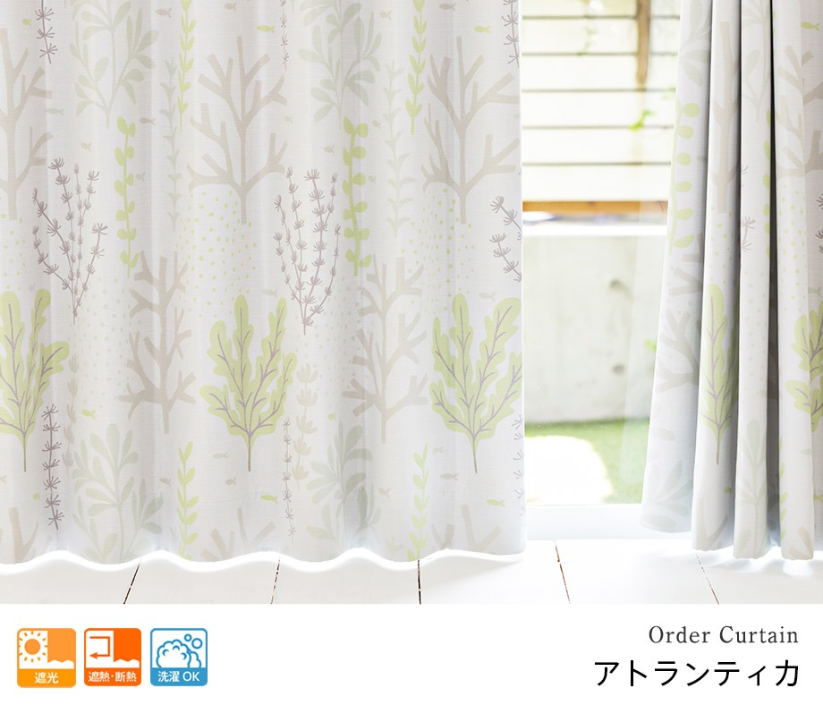 海をモチーフにした可愛いプリントの2級遮光カーテン「アトランティカ」アイボリー