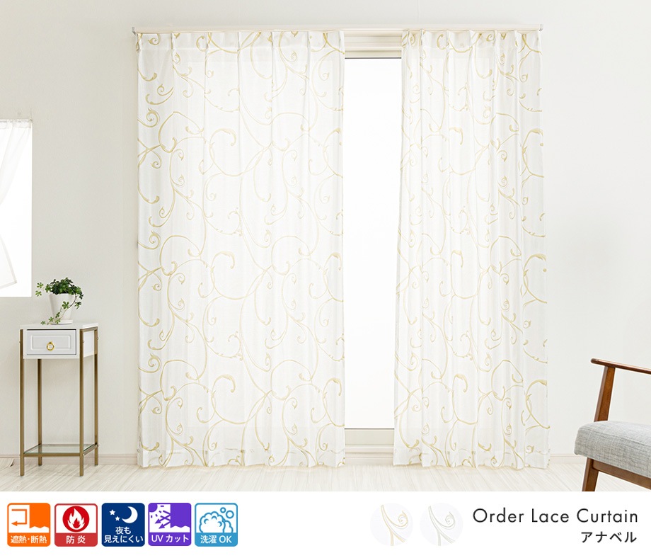 オーナメント文様をプリントした防炎遮像レースカーテン「アナベル」ベージュ