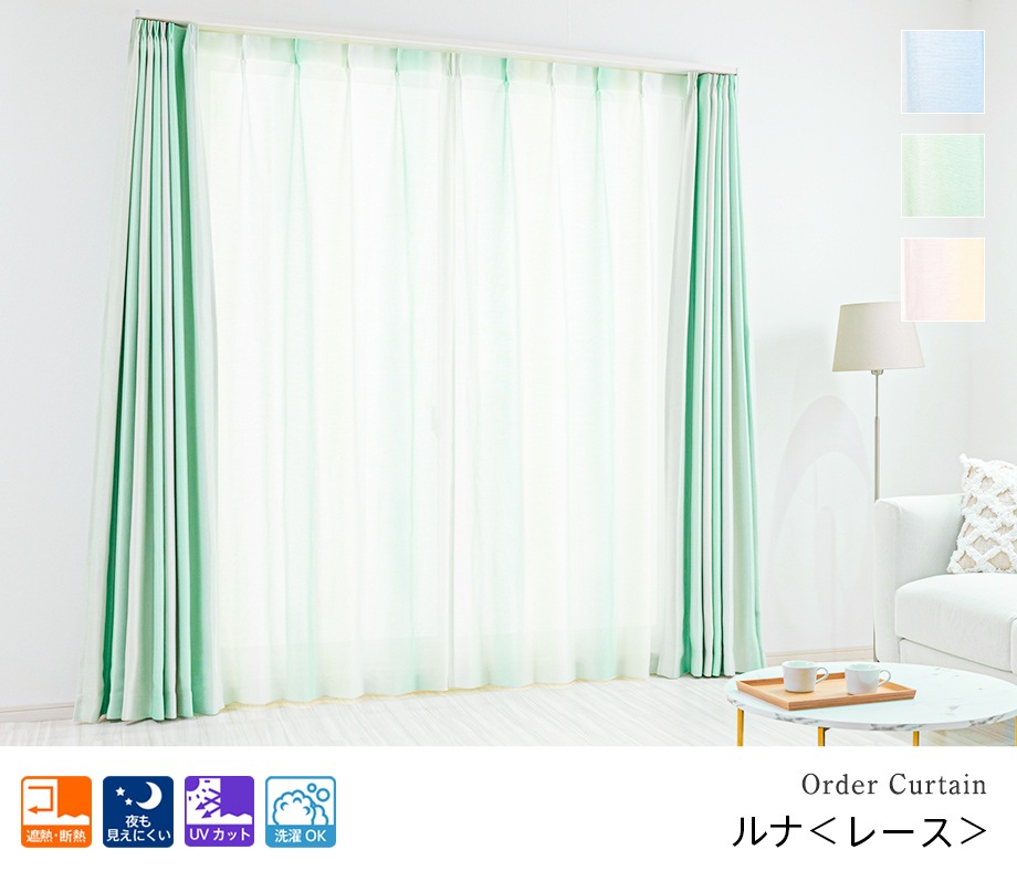 淡いペールトーンのグラデーション遮像レースカーテン「ルナ レース」グリーン