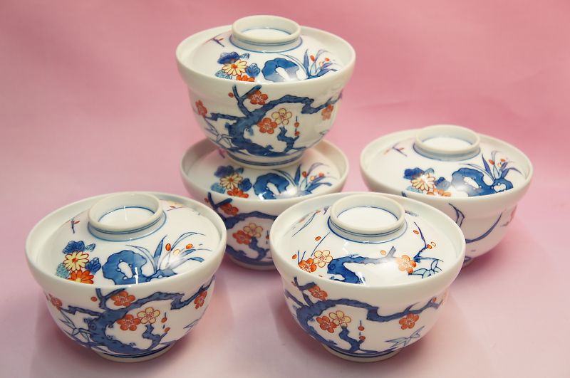 染錦四君子 蓋付き碗5客揃