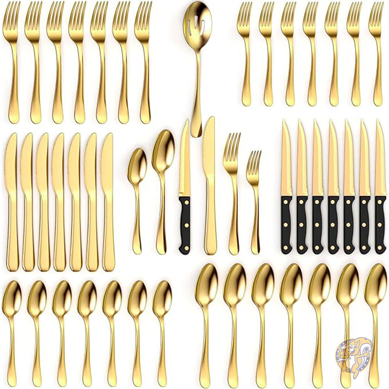 49ピース ゴールド シルバーウェア セット 8 人用 ステンレススチール ゴールド フラットウェア サービング セット カトラリ...