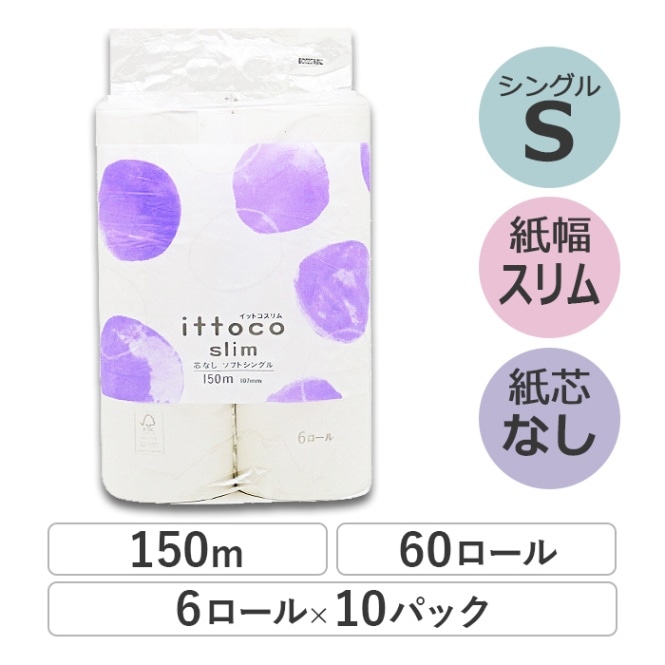 業務用 トイレットペーパー シングル 150m 6ロール 10パック イットコ 芯なし スリム幅(107mm) ミシン目なし 無香...
