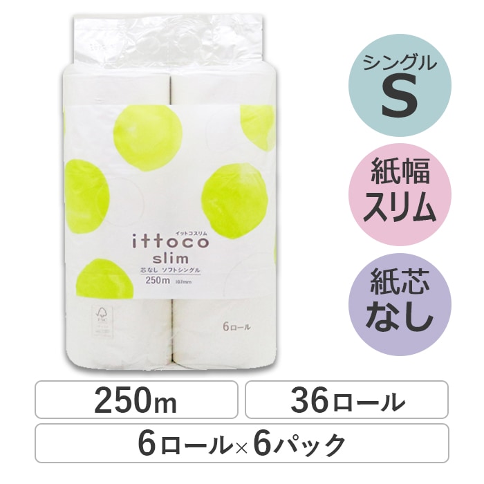 業務用 トイレットペーパー シングル 250m 6ロール 6パック イットコ 芯なし スリム幅(107mm) ミシン目なし 無香料...