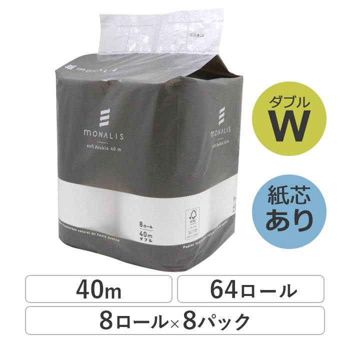 業務用 トイレットペーパー ダブル 40m 8ロール 8パック モナリス 芯あり 普通幅(114mm) ミシン目あり 無香料 10...