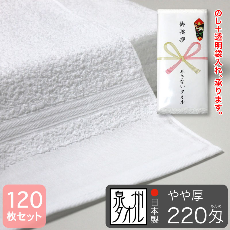 平地付き 白フェイスタオル 220匁 やや厚 粗品タオル 泉州タオル 日本製・120枚セット