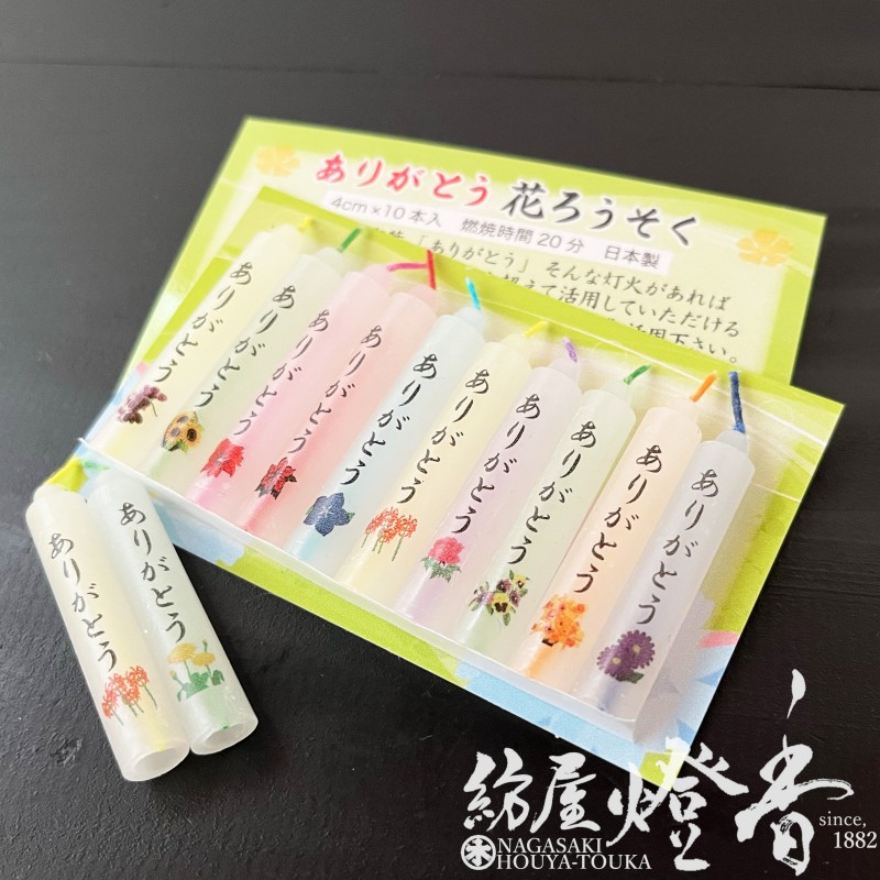 花/文字蝋燭『日本一美しい言葉【ありがとう・花ろうそく】10本入P袋[燃焼20分]』小池ろうそく