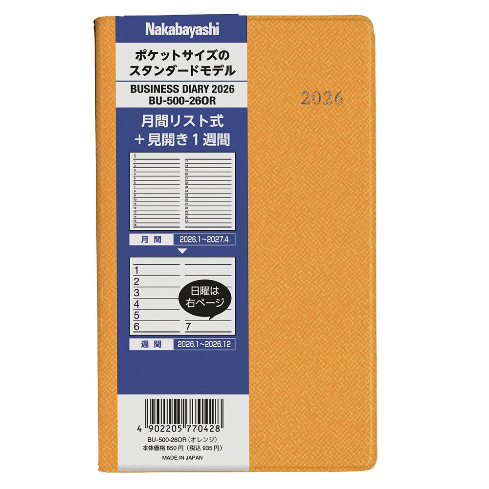 【未使用】ナカバヤシ 手帳 2026 ビジネスダイアリー スタンダード オレンジ BU-500-26OR●メール便●代引き不可