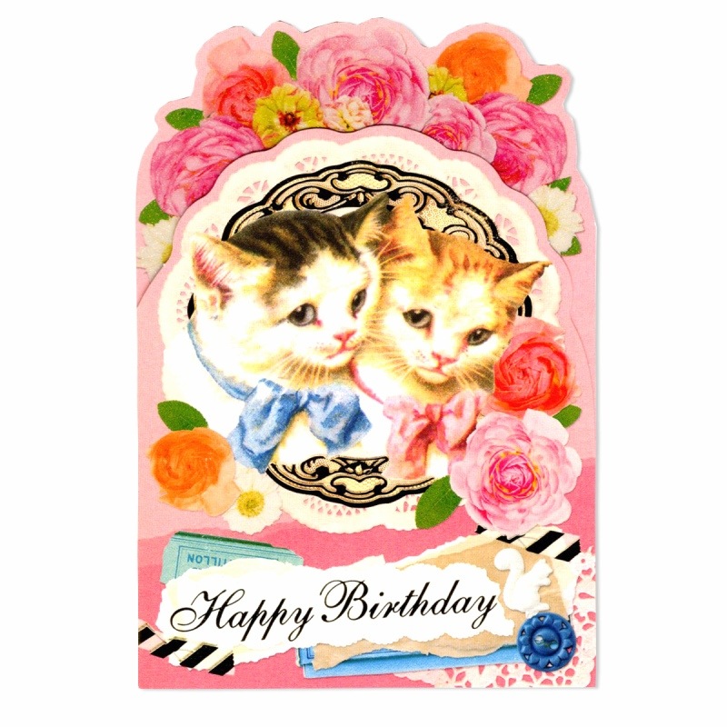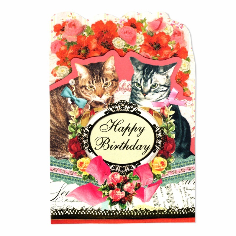 ANTIQUE 【誕生日】 キャット 箔押し・ラメ付き グリーティングカード (猫2匹×花×ピンク)