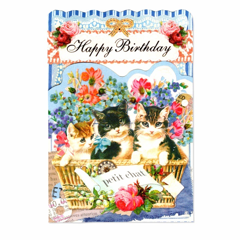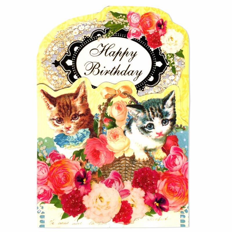ANTIQUE 【誕生日】 キャット 箔押し・ラメ付き グリーティングカード (猫3匹×花×かご)