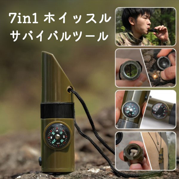 【即納】アウトドア用品 サバイバル マルチツール 7in1 ホイッスル 虫メガネ 温度計 LEDライト レンズ 方位磁石 薬入れ ...