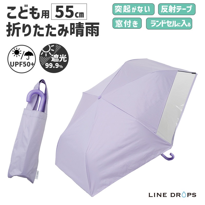 [54786] キッズ 折りたたみ傘 LINEDROPS 晴雨 55cm パープル 紫 透明窓 突起のない露先 反射テープ UVカ...