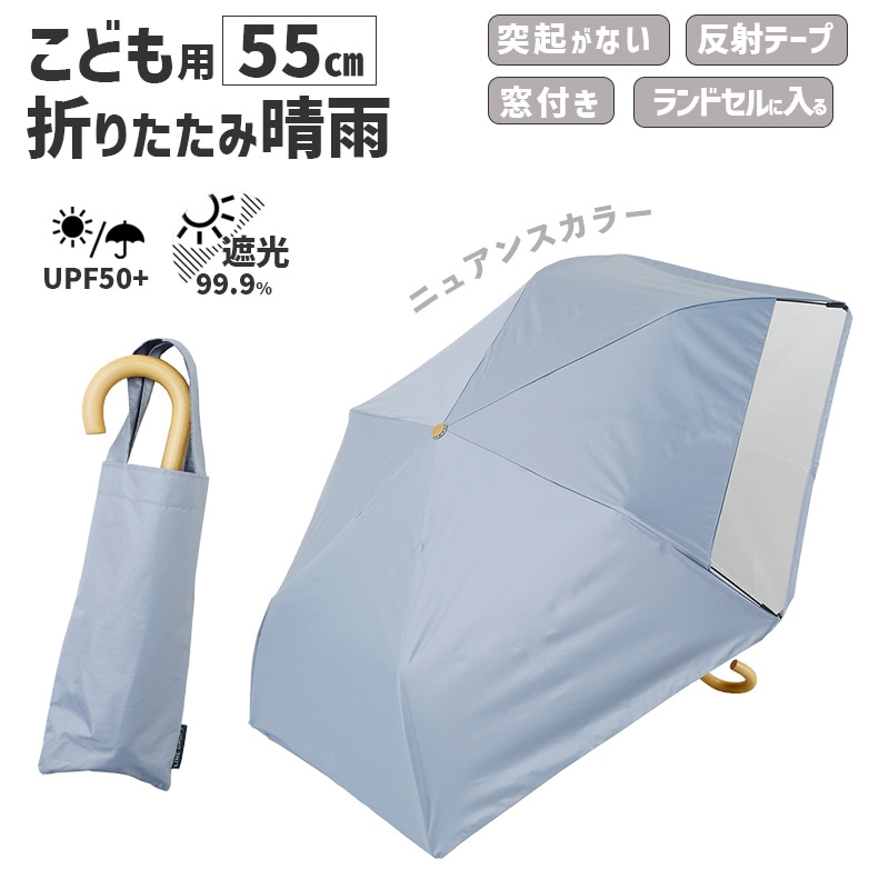 [54795] キッズ 折りたたみ傘 LINEDROPS 晴雨 55cm ブルーグレー 透明窓 突起のない露先 反射テープ UVカ...