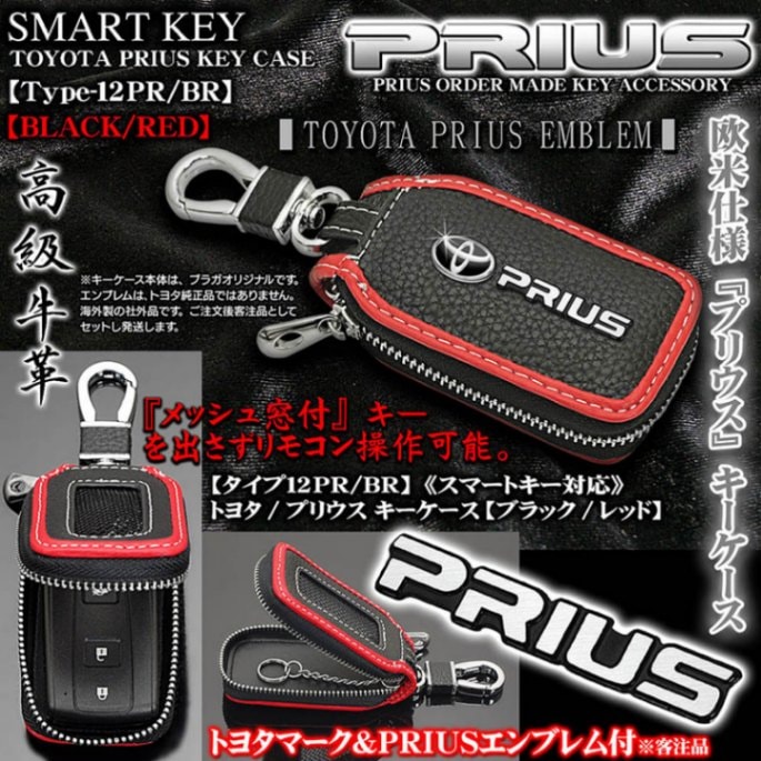 プリウス/PHV/α【タイプ12PR/BR】トヨタ/プリウス キーケース/牛革[ブラック/レッド]エンブレム付/キーホルダー/窓付...