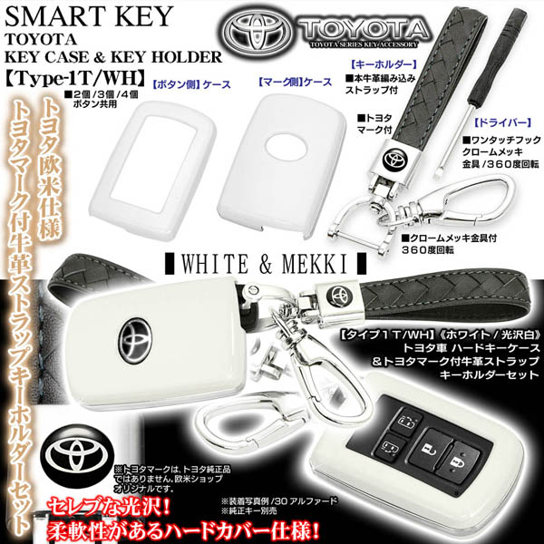 タイプ1T/WH[30系アルファード]トヨタ ホワイト/光沢白 ハードケース キーケース&トヨタマーク付牛革ストラップ キーホルダ...