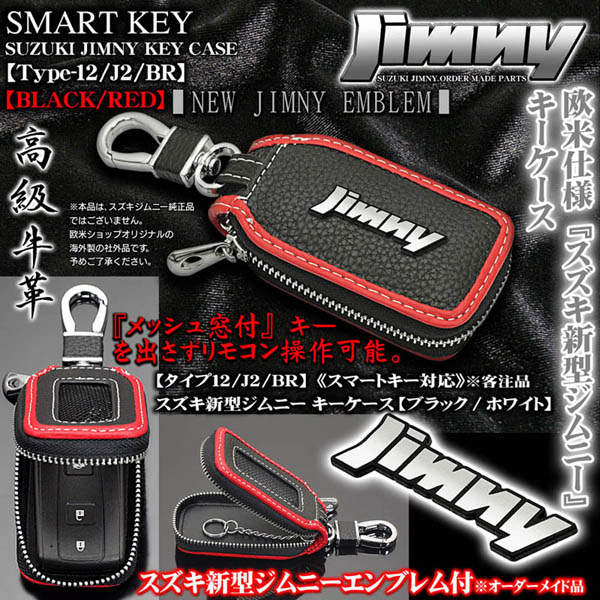 【タイプ12/J2/BR】スズキ新型ジムニーエンブレム付キーケース《ブラック/レッド》キーホルダー,窓付/スマートキー/牛革製/客...