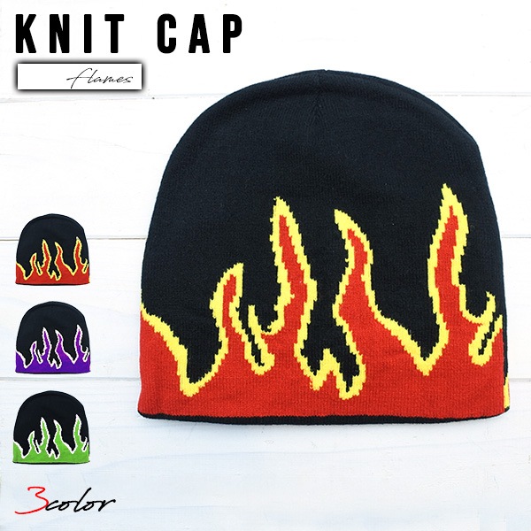 フレームス ニットキャップ 全3色 ニット帽 ブラック レッド パープル グリーン ビーニーキャップ ファイヤーパターン 炎 Fi...