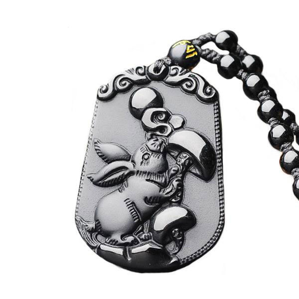 天然黒曜石 十二支 ネックレス 伸縮ビーズチェーン 鑑別書 ギフトボックス付き フルセット お守り ペンダント 縁起 美しい