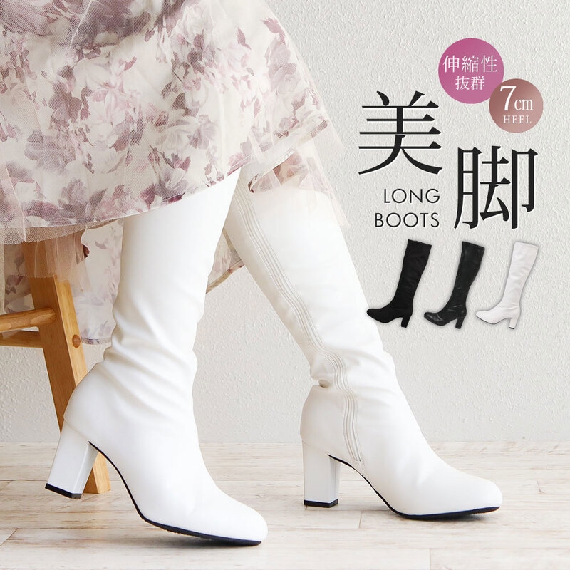ストレッチブーツ レディース ロング 黒 ヒール アーモンドトゥ サイドジップ 美脚 チューブブーツ 歩きやすい シンプル 605...