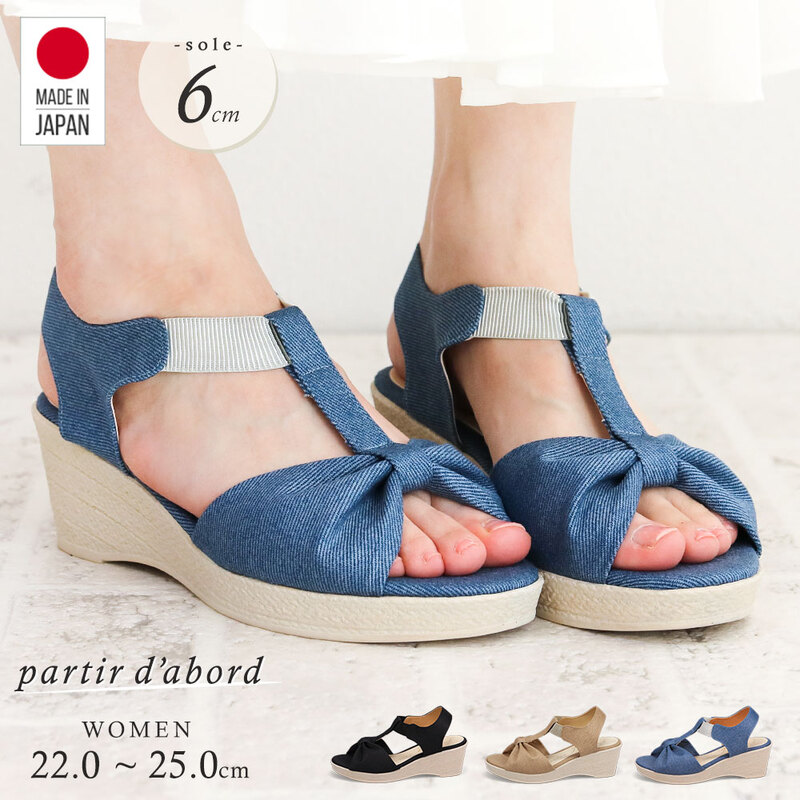 サンダル レディース バックストラップ オープントゥ ウェッジソール ストラップ リボン 夏 黒 ベージュ 青 日本製 パルティエ...