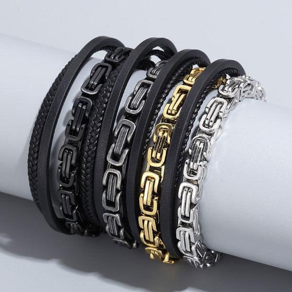 メンズ 編み込み レザー ステンレス チェーン 2連 3連 ブレスレット バングル 腕輪 ジュエリー アクセサリー ギフト プレゼ...