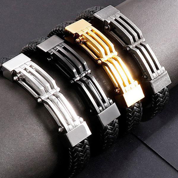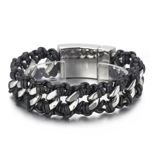 メンズ ステンレススチール 編み込み レザーブレスレット リンクチェーン バングル 腕輪 ジュエリー アクセサリー 贈り物 ギフト...