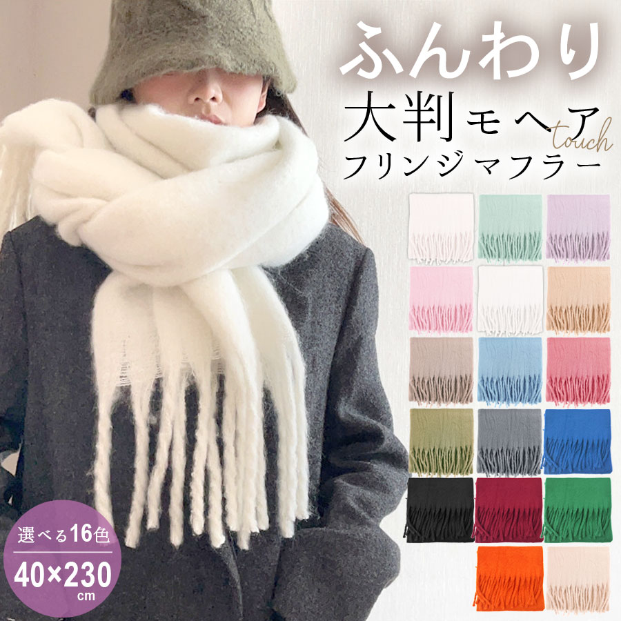 マフラー レディース 太フリンジ 厚手 大判 モヘアタッチ ストール モヘヤ 起毛 ボリューム 【送料pt100】